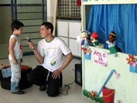 A Caravana do Meio ambiente, projeto desenvolvido por estudantes de biologia estagiários na Secretaria Municipal do Meio Ambiente e Sustentabilidade (SMMAS), esteve presente quinta-feira (18), no período da manhã e da tarde, na Escola Municipal Leão Nogueira Filho, no bairro Iporã. As atividades foram desenvolvidas em parceria com as secretarias de Educação e Saúde. O projeto vem sendo desenvolvido nas escolas desde março deste ano. Durante a visita, a Caravana oferece atividades como teatro de fantoches, teatro, oficina de leitura e reciclagem, pintura de rosto, cinema ambiental, caça ao tesouro ambiental e outras brincadeiras. “A programação é desenvolvida tendo como base os temas arborização urbana, respeito à natureza, respeito à água, queimada e reciclagem”, diz o biólogo e chefe de gabinete da SMMAS, José Luis de Carvalho Salles.